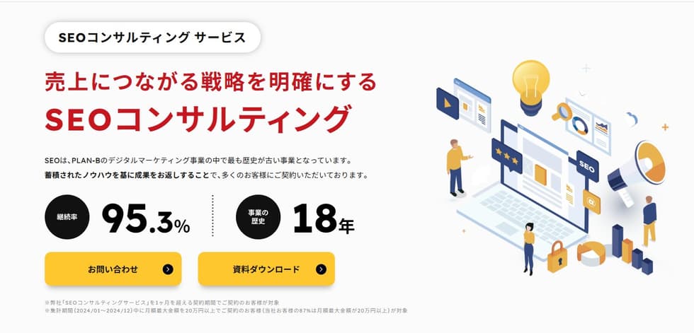 株式会社 PLAN-B | SEO事業16年、累計取引社数5,000社以上 | SEOコンサルティング(スタンダードプラン):月額50万円~ |